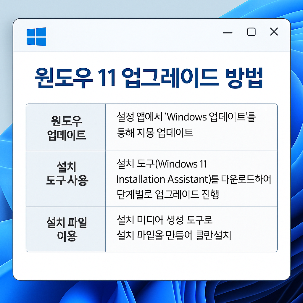 Windows 11 업그레이드는 Windows Update, 설치 어시스턴트, ISO 설치 미디어 세 가지 방식으로 진행할 수 있습니다.