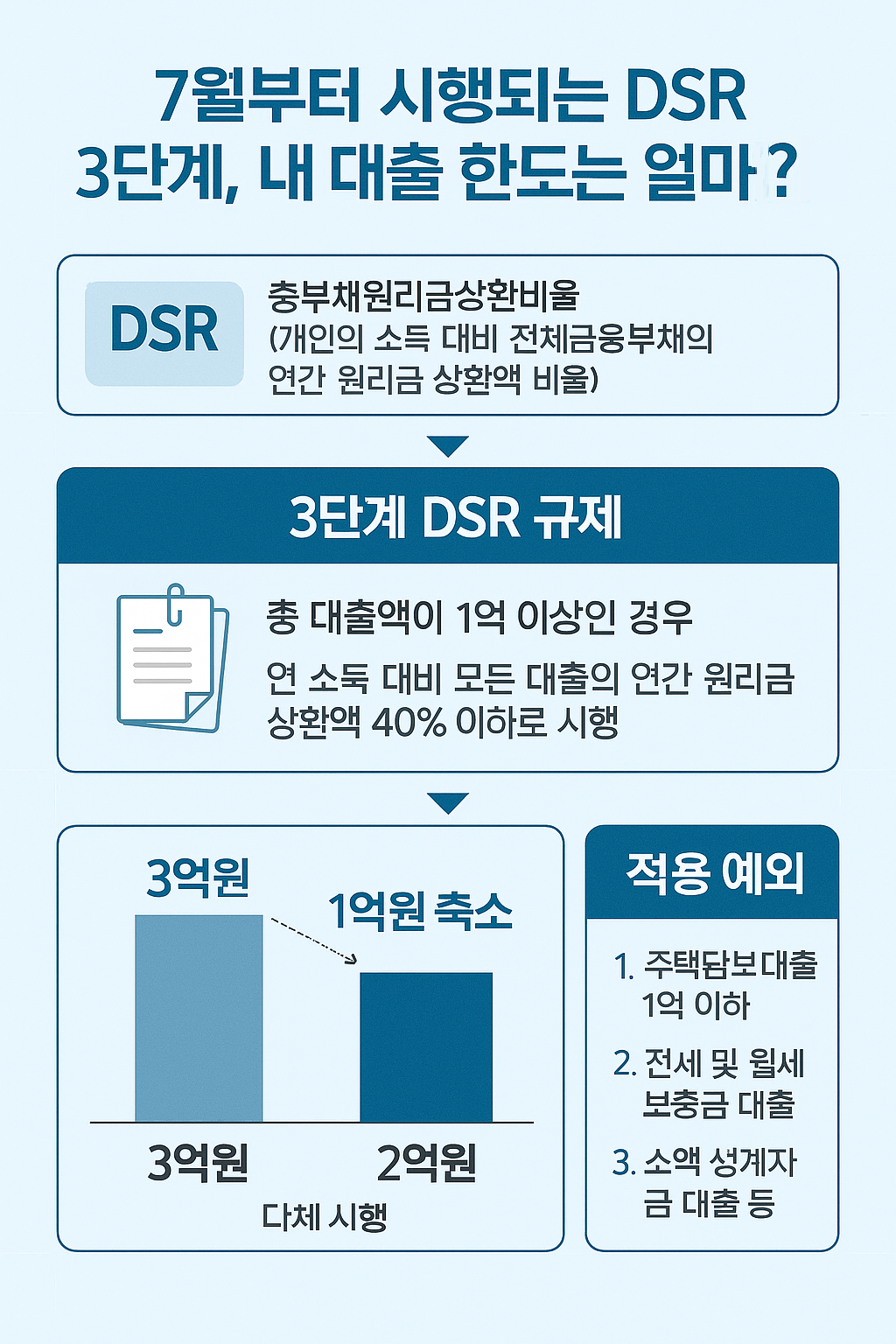 7월 이후 달라지는 금융 환경 속에서도 흔들림 없이 내 집 마련 계획과 재무 설계를 이어가기 위해, DSR 3단계를 정확히 이해하고 대비 전략을 마련하는 것이 무엇보다 중요합니다.