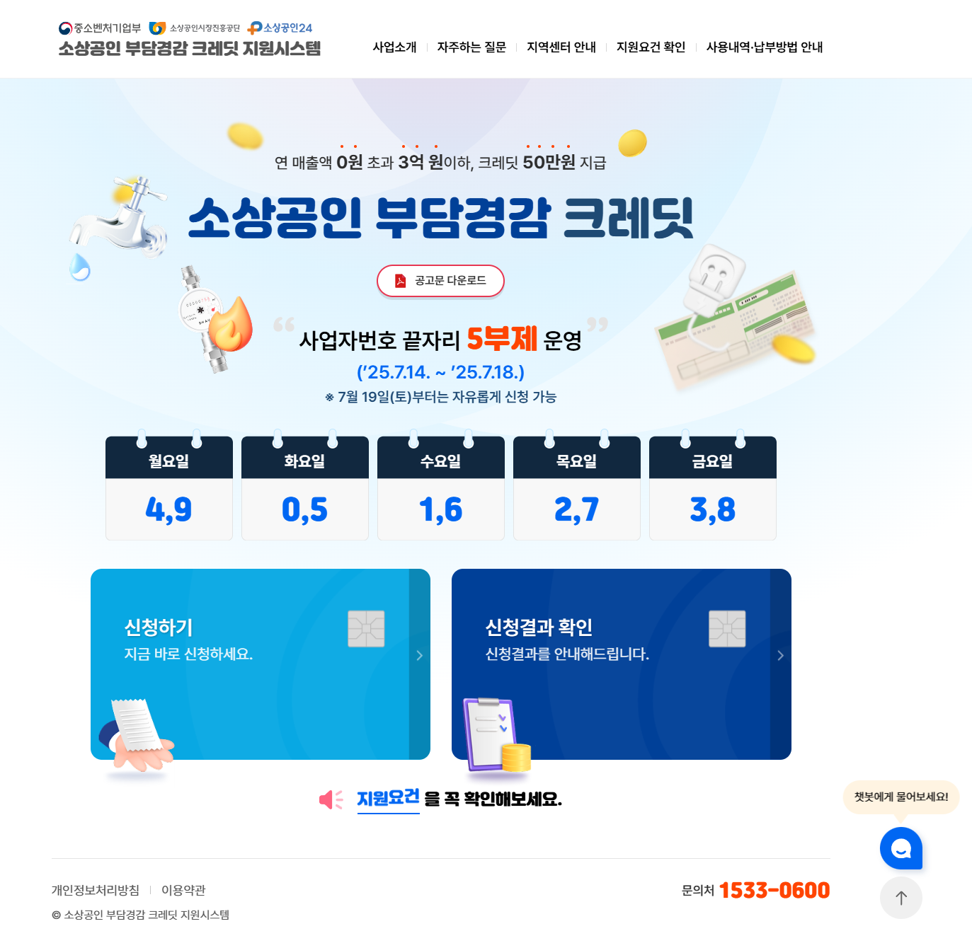 특히 이번 지원사업은 소상공인시장진흥공단이 운영하며, ‘부담경감크레딧.kr’ 또는 ‘소상공인24’ 사이트에서 신청할 수 있습니다. 접수 초기 혼잡을 줄이기 위해 사업자등록번호 끝자리 기준 5부제를 7월 14일부터 18일까지 운영하며, 11월 28일 오후 6시까지 신청 가능합니다(예산 소진 시 조기 마감 가능)